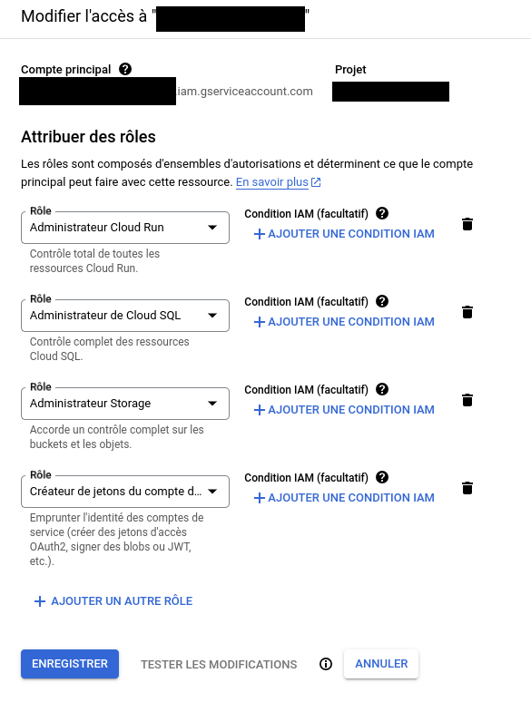 django@deploy-project-django.iam.gserviceaccount.comAjouter les rôles suivants : Administrateur Cloud Run, Administrateur de Cloud SQL, Administrateur Storage et Créateur de jetons du compte de service :